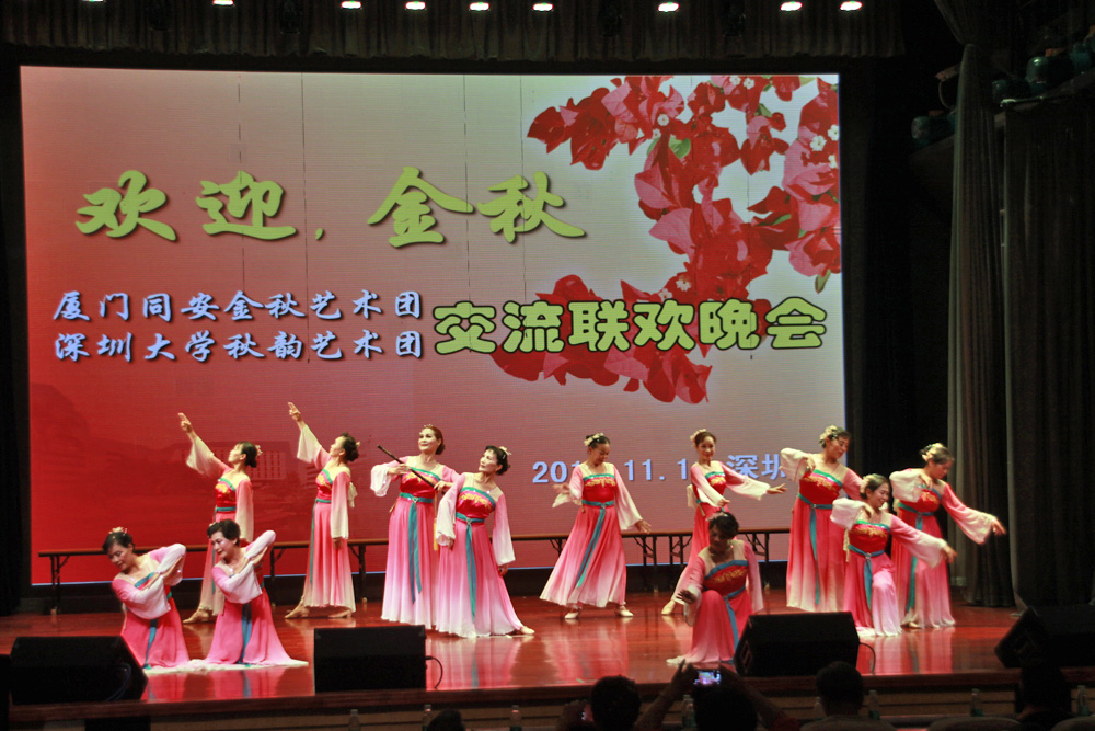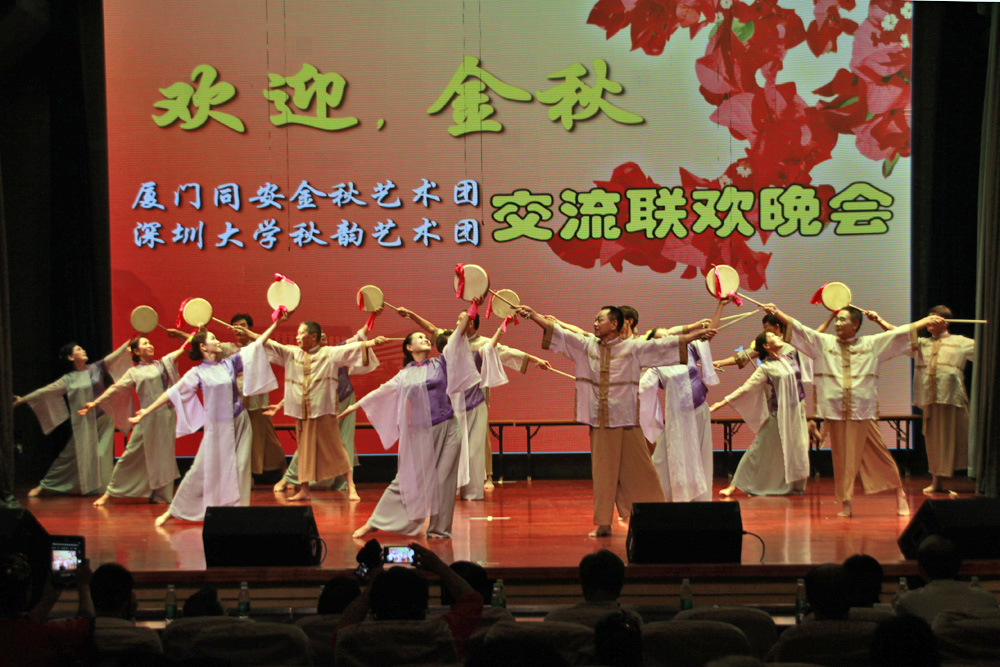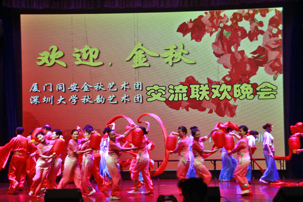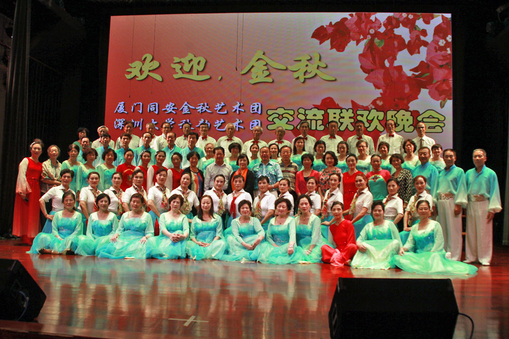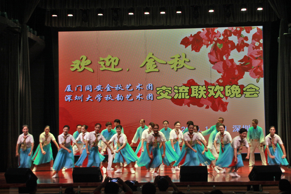 厦门同安金秋艺术团是由厦门市同安区退休职工组成的一个热情如火艺术团,几年来,全体团员一直坚持做文化志愿者,热情用文化艺术服务社会,回报社会,长期到工厂、乡村、社区、海岛做公益演出,传播新思想、新文化,活跃新生活。他们还到金门与当地居民交流,传播大陆人民对台湾人民血浓于水的情谊。这个艺术团擅长具有闽南特色的舞蹈,多次获得奖项。而深大秋韵艺术团是由一批热爱歌唱舞蹈的退休教师所组成的群众艺术团体,以声乐见长。他们中有不少教授、副教授,平均年龄超过65岁,其中几位团员已经年逾八十。去年十月,秋韵艺术团应邀赴厦门,与金秋艺术团举行了一场名为“你好,秋天”的联欢。这次厦门金秋艺术团回访深大,是两个退休艺术团的密切联系和交流。