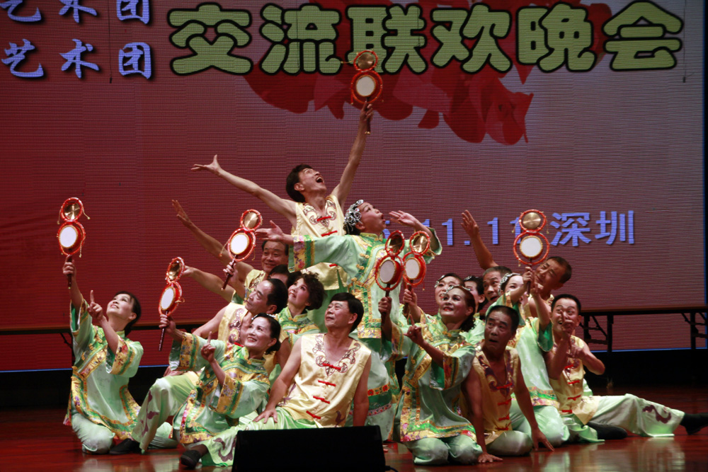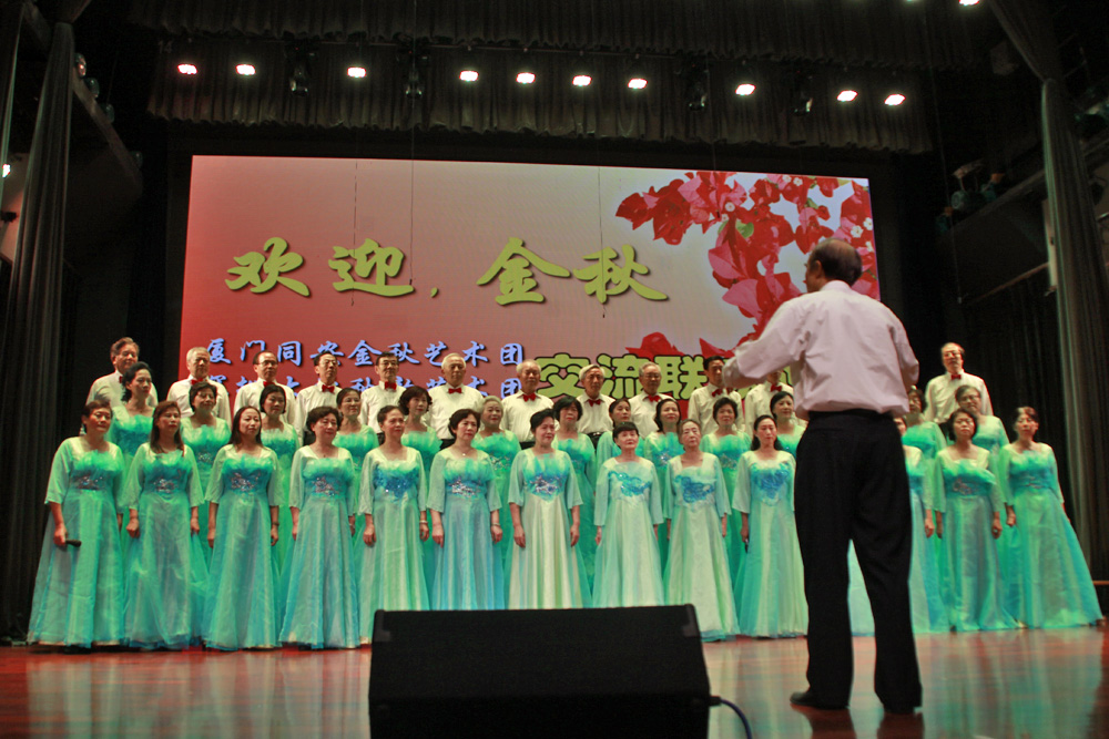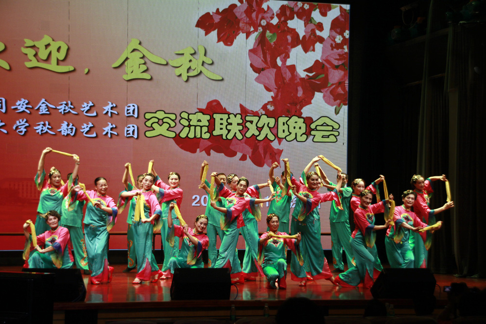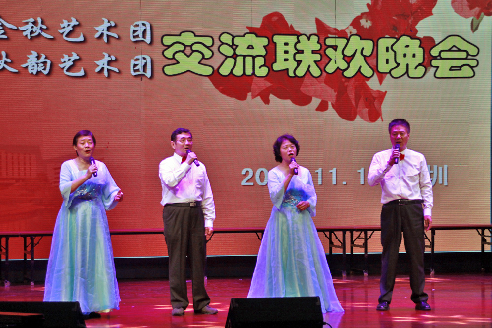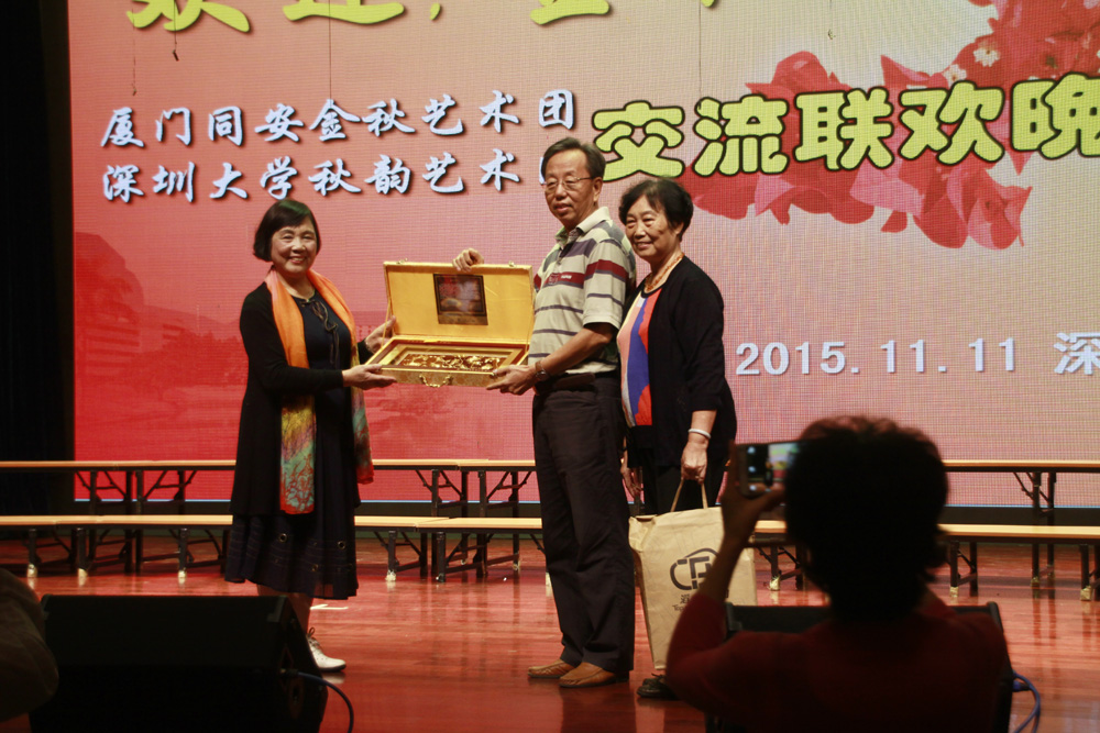 厦门同安金秋艺术团是由厦门市同安区退休职工组成的一个热情如火艺术团,几年来,全体团员一直坚持做文化志愿者,热情用文化艺术服务社会,回报社会,长期到工厂、乡村、社区、海岛做公益演出,传播新思想、新文化,活跃新生活。他们还到金门与当地居民交流,传播大陆人民对台湾人民血浓于水的情谊。这个艺术团擅长具有闽南特色的舞蹈,多次获得奖项。而深大秋韵艺术团是由一批热爱歌唱舞蹈的退休教师所组成的群众艺术团体,以声乐见长。他们中有不少教授、副教授,平均年龄超过65岁,其中几位团员已经年逾八十。去年十月,秋韵艺术团应邀赴厦门,与金秋艺术团举行了一场名为“你好,秋天”的联欢。这次厦门金秋艺术团回访深大,是两个退休艺术团的密切联系和交流。