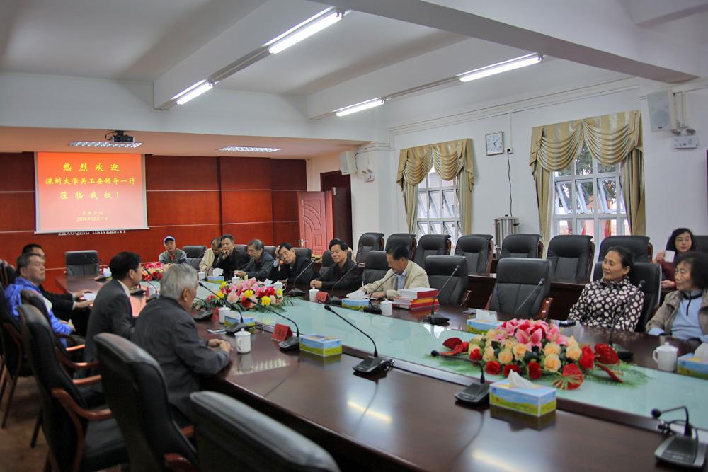 11日下午,深大关工委访问团来到坐落于风景优美的七星岩附近的肇庆学院,受到肇庆学院领导与该校关工委领导的热烈欢迎。参观了美丽的校园和校史馆之后,宾主来到校园北侧、北岭山下的文笔峰,进入西江历史文化研究院的会议室,开始进行工作交流。肇庆学院主管关工委的党委副书记叶峥嵘向深圳大学关工委的同志介绍肇庆学院发展状况,学院关工委主任胡金宁和离退休工作办公室主任孙占海分别介绍关工委工作情况。肇庆学院立足服务地方,在为地方经济社会发展培养人才、提供文化与科技支持方面成果卓著,该校关工委与学院团委、学生处紧密配合,开展各种生动活泼的活动,为弘扬社会主义核心价值观、培养有中国特色社会主义事业建设者和接班人所做的工作给深大关工委的同志们留下深刻印象。梁桂麟副主任代表深大关工委介绍了我校关心下一代工作的情况。访问期间,肇庆学院的和飞院长、黄劲松副书记、胡宝坚同志(副校级干部、原党委副书记)等和深圳大学关工委同志见面,表示热情欢迎和关切。