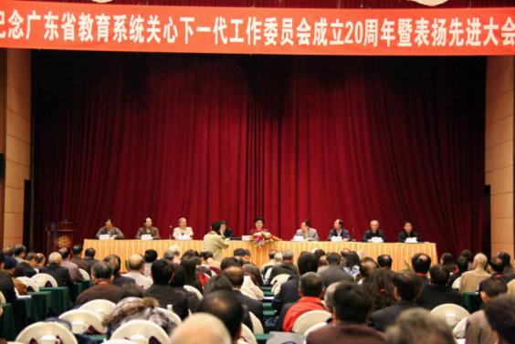11月30日,纪念广东省教育系统关工委成立20周年暨表扬先进大会在广州三寓宾馆会议中心召开,教育部关工委主任田淑兰、广东省关工委副主任陈坚、中共广东省委教育工委副书记兼教育厅党组副书记景李虎、教育厅副巡视员胡振敏、广东省教育厅关工委主任杜联坚等领导出席大会,全省高校、各市教育局以及部分中小学关工委代表共200多人参加大会。