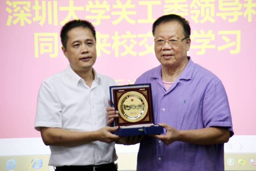 向广东石油化工学院赠送深大纪念品。