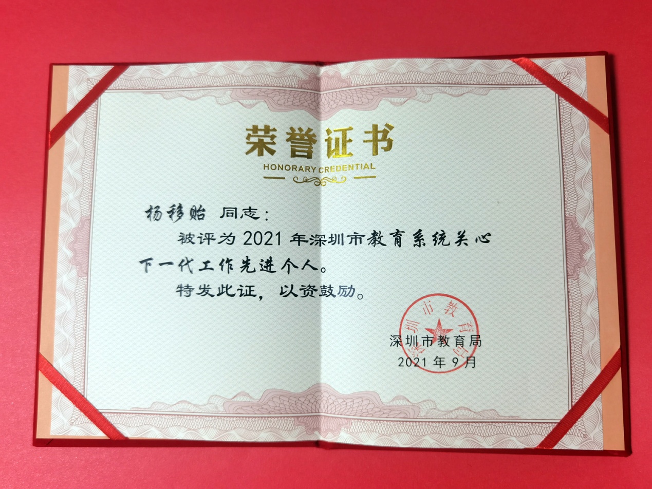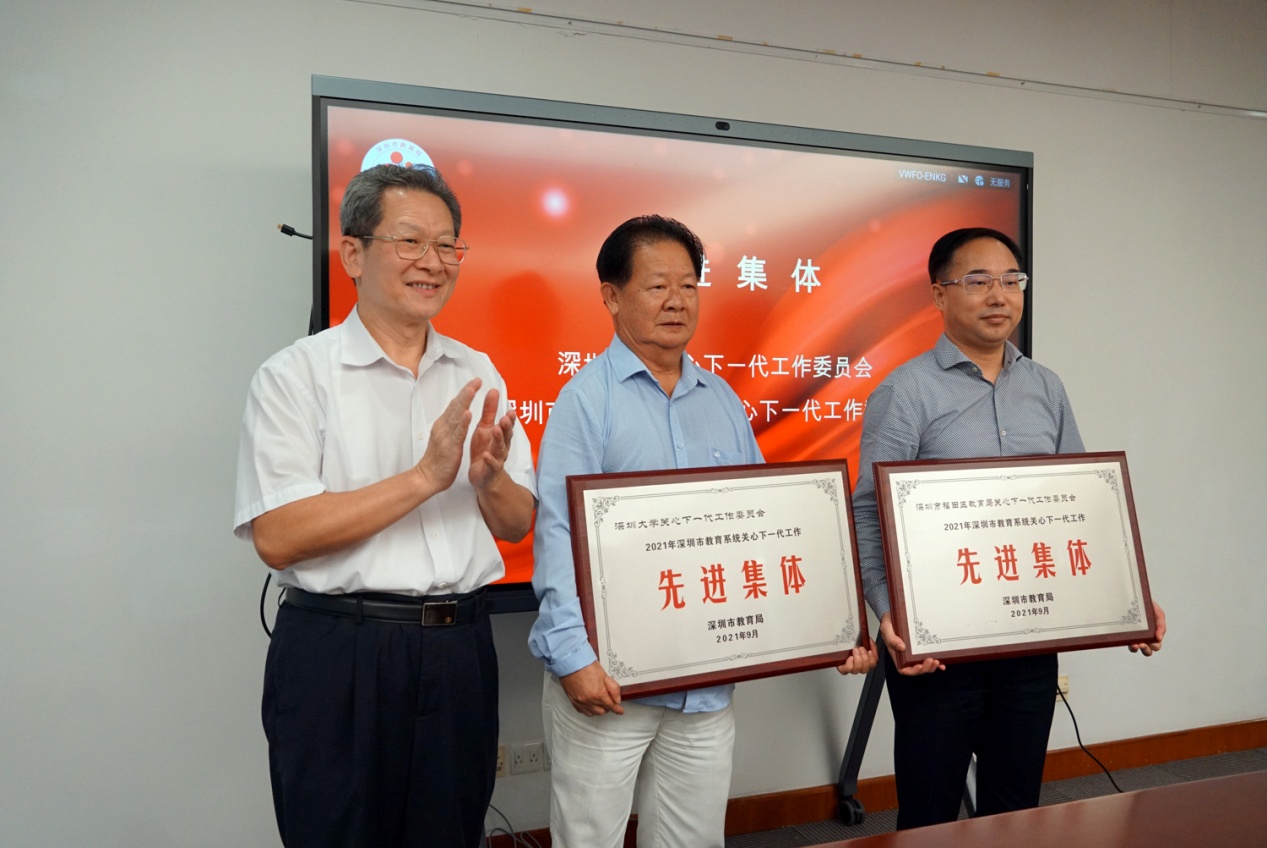 会上向离任关工委老领导赠送纪念品,向获评2021年深圳市教育系统关心下一代工作先进集体和个人颁发荣誉证书和奖牌。我校关工委获得先进集体称号,杨移贻秘书长获评先进个人。