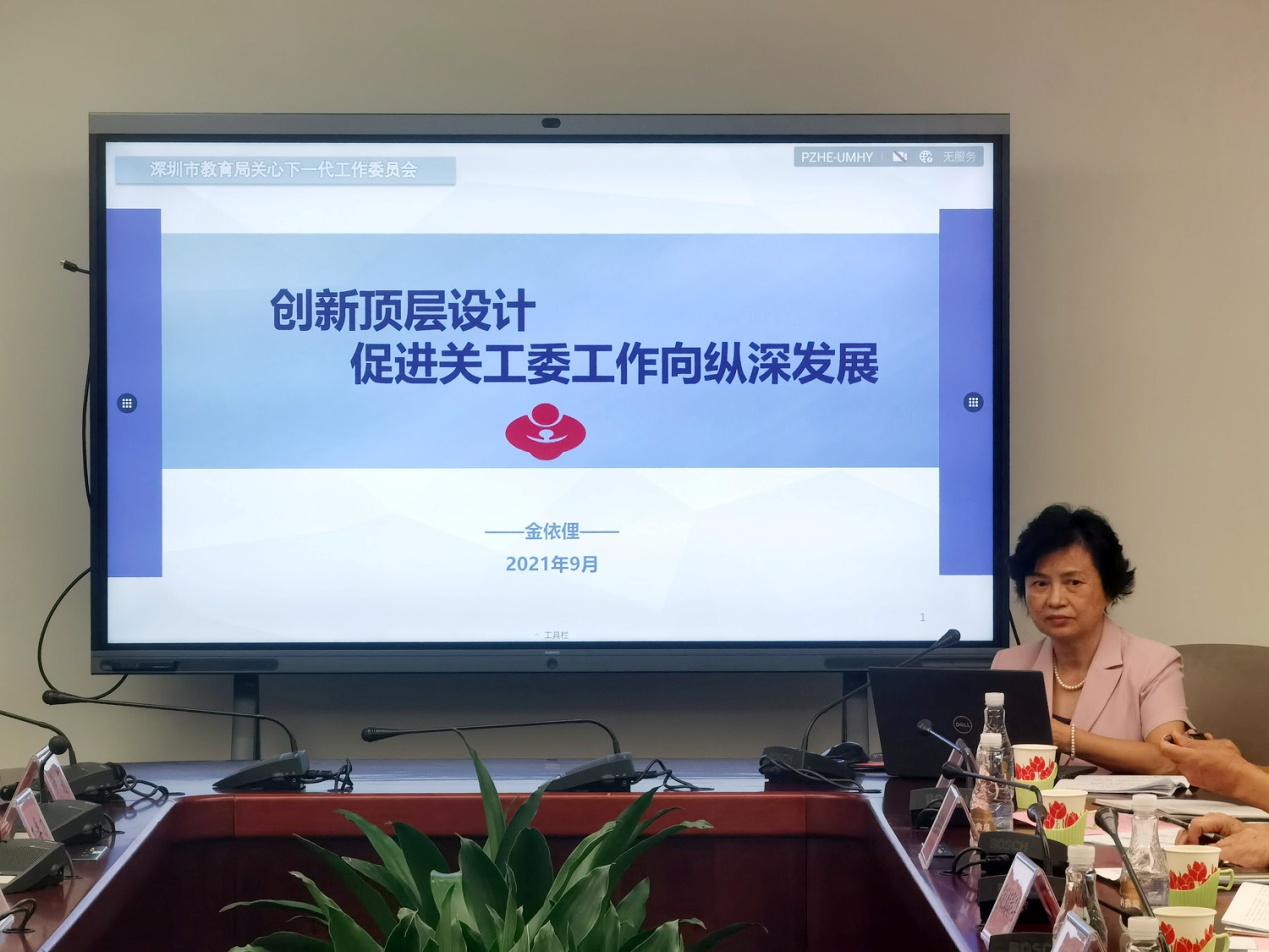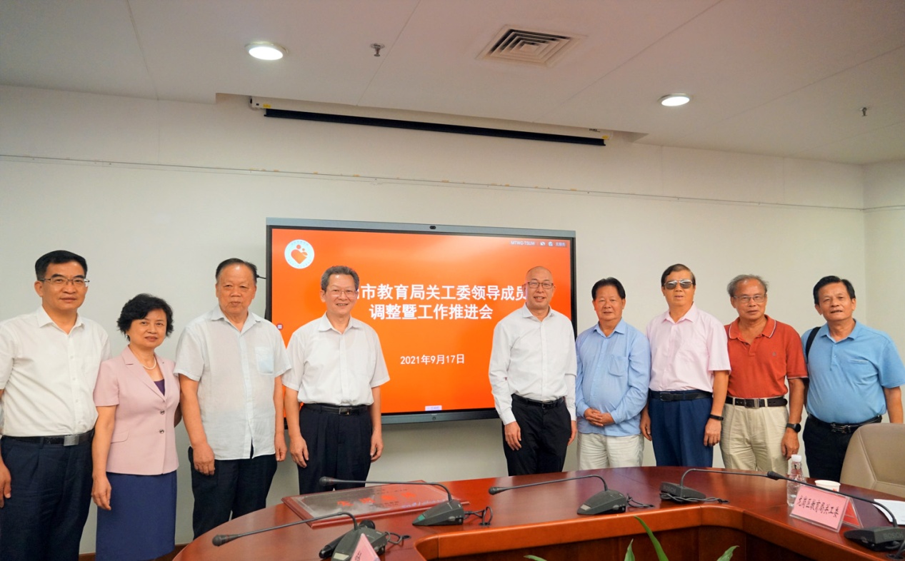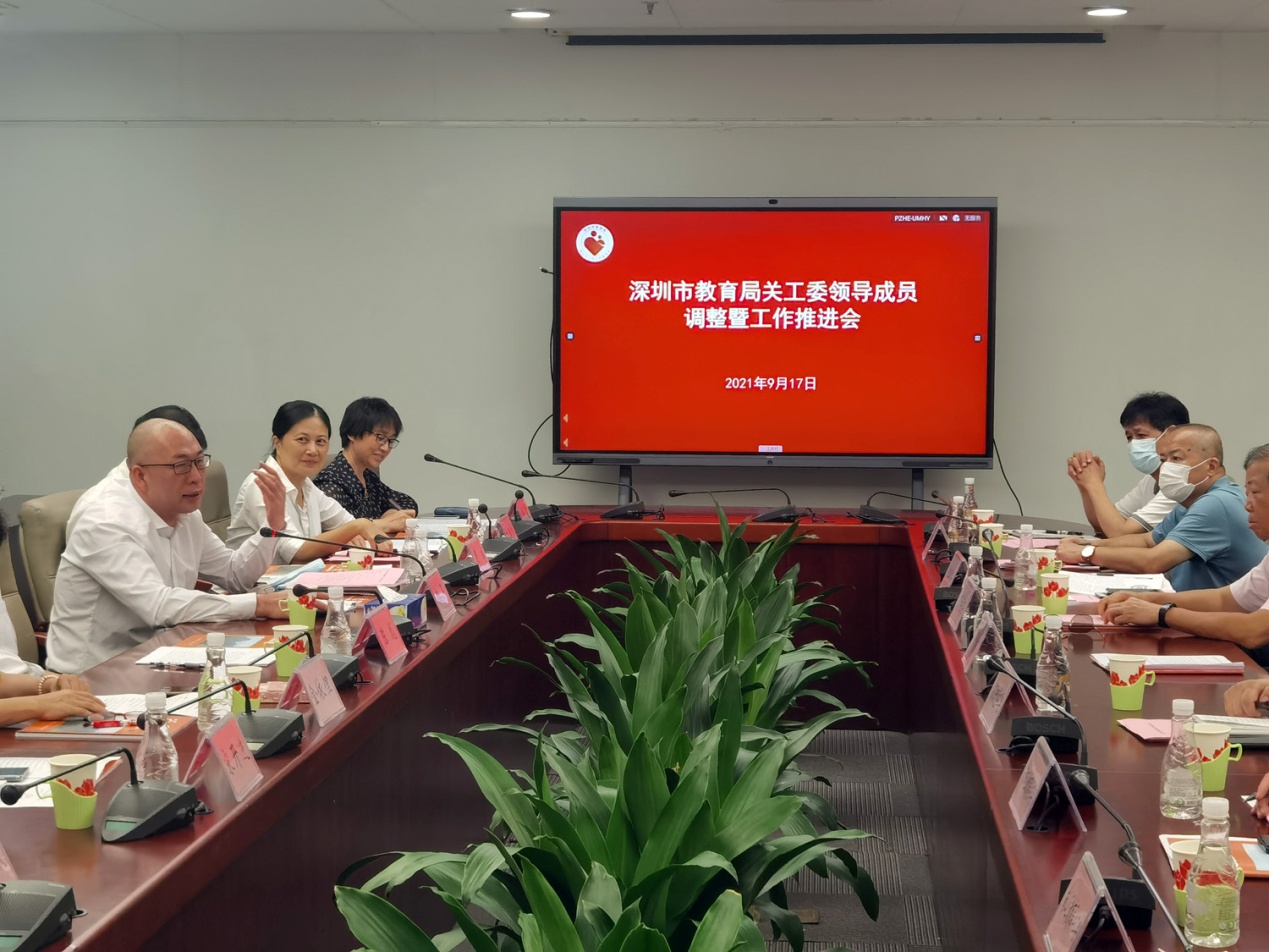 会议由市教育局关工委秘书长钟莉主持。会上宣读了《深圳市教育局关于调整深圳市教育局关心下一代工作委员会领导成员的通知》。调整后的市教育局关工委新的领导班子实行“双主任制”,即由一位在职的主管领导和一位离退休老干部同时担任主任。主任是杨平(市委教育工委副书记)、金依俚(原政府教育督导室主任),副主任李建功等11位在职的区(包括新区、深汕特别合作区)领导干部,委员是20位各区、各高校关工委主任(退休老干部),秘书长是钟莉(原南山区教育局督导室专职督学、督学事务中心主任)。
