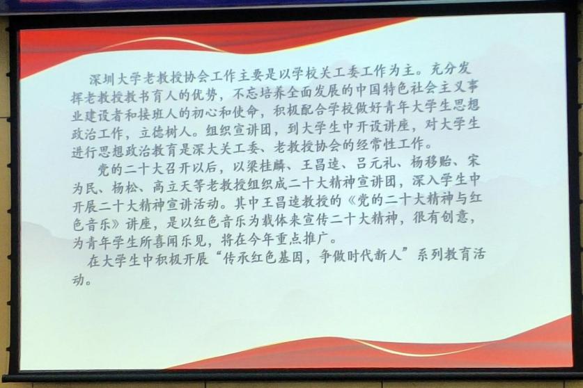 彭新一常务副会长在总结中提及深圳大学,指出深圳大学分会以关心下一代工作为主线,为大学生健康成长作出贡献。