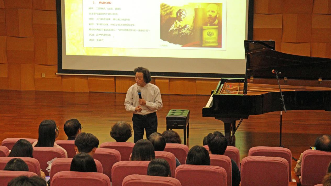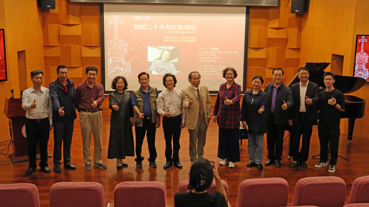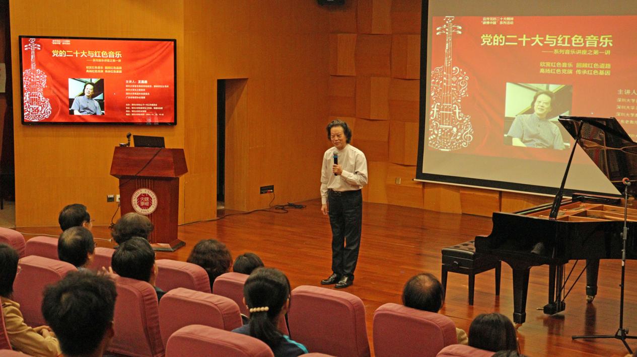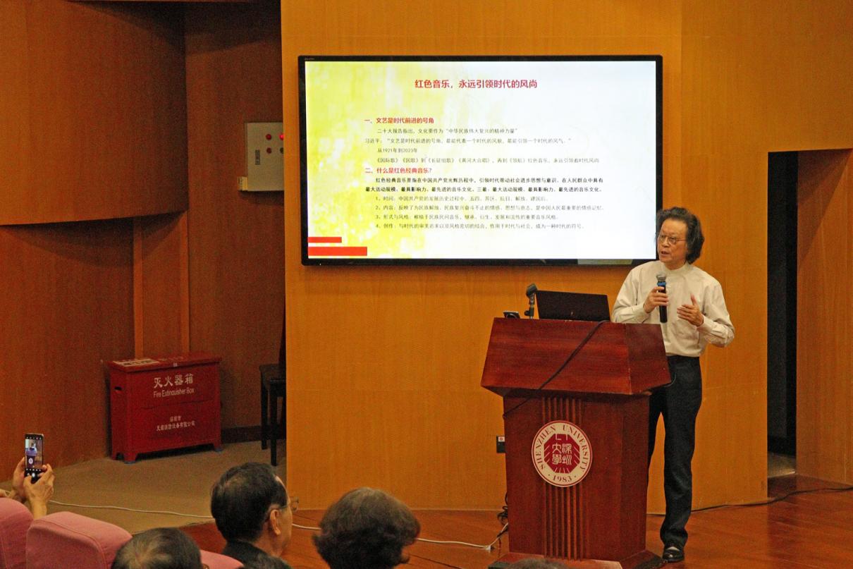 2023年11月23日晚上,一场别开生面、精彩纷呈的讲座在深圳大学音乐厅举办。这是深大关工委委员、离退休党委委员王昌逵教授主讲的《党的二十大与红色音乐》讲座。音乐厅时而响起嘹亮的乐音,时而发出热烈的掌声。王教授充满激情的讲述,伴随激越的音乐,像潺潺流水,滋润着在场百余位师生的心田,引起大家的共鸣、感动和思索。