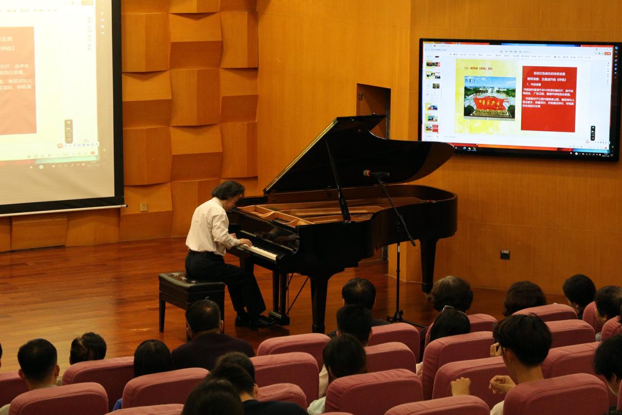 这是一场由深大关工委主办、校党委学生工作部和离退休党委协办、艺术学部承办的红色音乐讲座,也是学校关工委“读懂中国”系列活动中的一个。王教授出身于红色根据地的红色家庭,有深厚的红色文化情怀。他以音乐艺术家的学术涵养和精湛技艺,巧妙地将红色音乐欣赏和讲党史、革命史、二十大精神等有机结合起来,通过选取建党以来不同历史时期的红色音乐进行演奏、播放视频、分析红色音乐产生的背景和流行的过程,将党的初心使命、经历的艰辛与辉煌、振兴中华的宏伟目标、中国特色社会主义必然成功的过程与信念,演绎得淋漓尽致,赢得满场喝彩。他的讲座分为四个部分,分别是序言:红色音乐,永远引领时代的风尚,一,党的二十大精神“不忘初心,牢记使命”;二,二十大精神“江山就是人民,人民就是江山”;三,二十大精神“新时代新征程”。用《国际歌》、《不忘初心》、《苏区干部好作风》、《呼唤》、《长征组歌:冲破封锁线》、《我的祖国》和《深大人之歌》等红色歌曲、乐曲串起来。其中既有视频播放,又有现场钢琴演奏;既有兴国老干部的深情演唱兴国山歌并寄予深大师生的视频,也有王教授对红军二万五千里长征和革命根据地兴国人民对革命的忠诚与奉献的讲述,还有他们亲自到红区采访和表演的故事。党的光辉历史、革命道路、二十大精神、改革开放的成就和中华民族伟大复兴的豪情,通过红色音乐流淌在听众心头,激励着大家前进。最后,讲座在《歌唱祖国》的全场大合唱中结束。