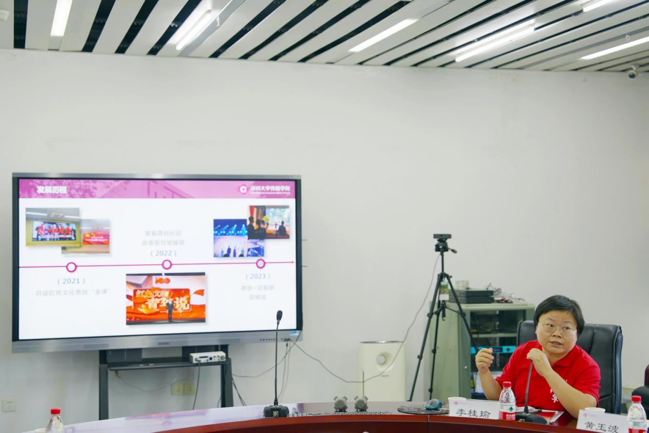 传播学院副院长、马克思主义新闻观创意传播与实践党支部书记黄玉波介绍《亲爱的红军》诞生和发展过程以及特色党支部建设情况。