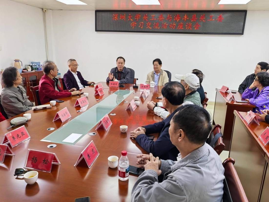参观完红宫红场之后,大家来到海丰县关工委参观与交流。在座谈会上,海丰县关工委陆得源主任向客人介绍了他们开展关心下一代工作的情况,深大关工委梁桂麟副主任对海丰县关工委今年获得国家先进关工委称号表示热烈祝贺,表示要学习海丰县关工委的好经验,并简要介绍深大关工委的情况。杨移贻秘书长介绍了深大关工委开展创建“五好”关工委的做法,重点介绍5个“五老工作室”的设置和积极创新关心下一代工作的情况。红色音乐工作室王昌逵主任和青少年AI培训工作室欧阳康主任介绍了各自工作室开展关心下一代工作的情况,并表示与海丰县关工委开展合作的意向,受到海丰县关工委和海丰县教育局关工委的欢迎。