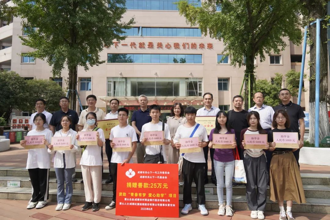 同时,成都市关心下一代基金会通过“青春有梦 爱心助学”公益慈善项目动员社会力量奉献爱心,助学活动得到成都市农村商业股份有限银行、成都红旗连锁股份有限公司董事长曹世如等爱心企业、爱心人士的广泛支持,共筹集到助学金25万元。