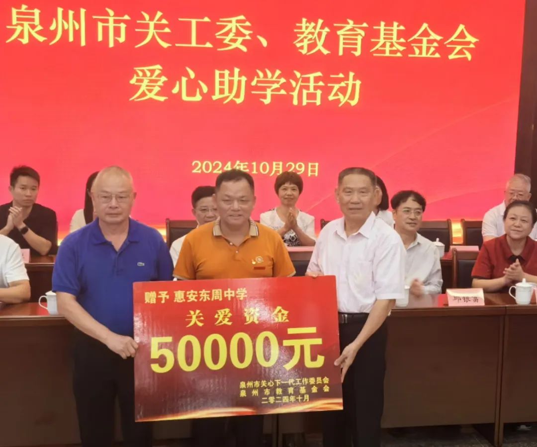 捐赠仪式上,泉州市关工委和泉州市教育基金会向东周中学捐赠5万元助学资金,帮助该校进一步改善办学条件,提高办学水平。