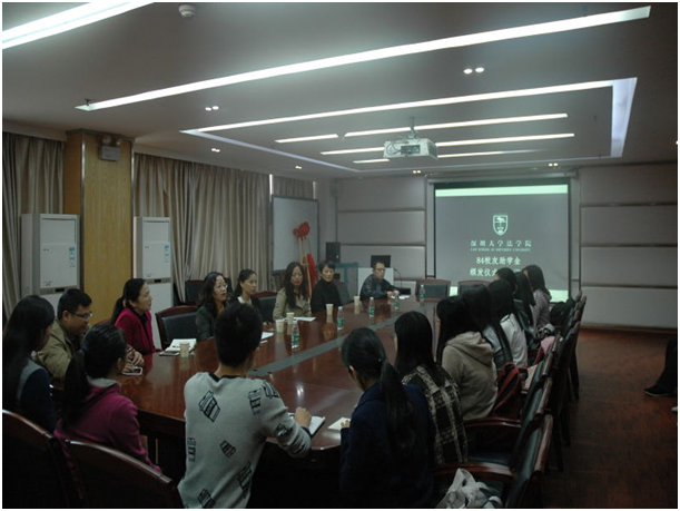 11月10日15时,法学院84级校友助学金颁发仪式暨“法律人的职业之路”讲座在法学院第一会议室举行。法学院党委书记李卫英、副书记弋灵,院团委书记刘钧老师,辅导员付义圣老师、李宇洁老师,法学院84级校友李亚轩、曾丽燃、陈秀珍、李晶晶以及12位受资助学生出席了座谈会。