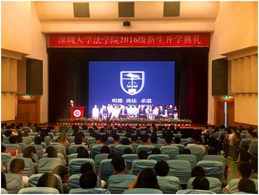 2016年9月12日下午,深圳大学法学院在国际会议厅举办了2016级新生开学典礼。法学院院长黄亚英及其他学院领导班子成员、各学科主任、导师组组长、各专业课老师、新生班主任、教务秘书、辅导员等40余位老师、91名研究生新生、253名本科生新生共同参加了本次开学典礼。开学典礼由法学院党委书记李卫英主持。