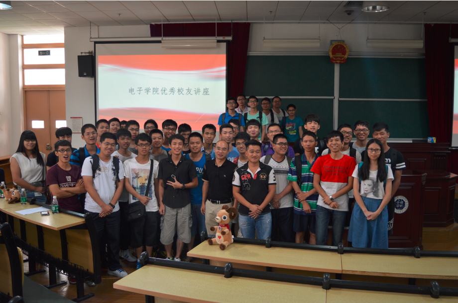 2015年9月18日下午,电子科学与技术学院在文科楼H4-101举办电子科学与技术学院校友系列讲座。前任电子学院学生会主席陈上海主持讲座,电子科学与技术学院两位校友:深圳市思奥特光电技术有限公司CEO麦剑聪和和为顺网络技术有限公司总经理刘基为本次主讲嘉宾,学院党委副书记林济霖,学院团委书记张喆,学生社区辅导员李鹏,全体2015级新生等参加了本次讲座。