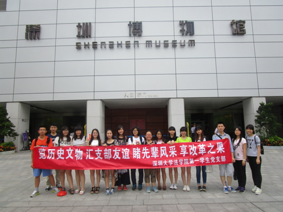 2015年5月10日下午,法学院第一学生党支部开展了参观深圳博物馆的活动。这次活动的主题为“览历史文物,汇支部友谊,睹先辈风采,享改革之果”,通过了解深圳的发展历史和名人往事,鼓励学生党员学习先辈的拓荒精神和爱国热情,不断学习,自强不息。