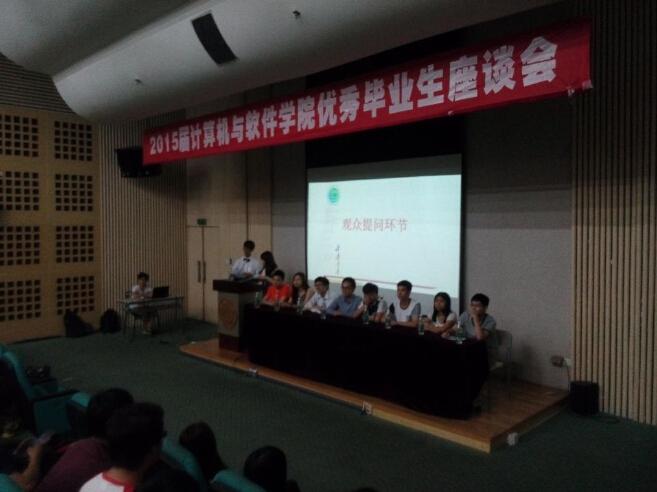 时下流传着这么一句话——谁的青春不迷茫?的确,大学四年,是我们从学生时代步入社会的过渡时期。有些同学拥有美好而坚定的理想却不知如何行动去实现;有些同学在为自己未来的工作而苦恼,虽然对未来充满美好的憧憬,但是也对自己的人生感到迷茫。那么我们该如何克服这种迷茫?我们该如何为我们的未来努力?我们该如何选择自己的方向?2015年5月16日,计算机与软件学院在科技楼一号报告厅举办2015届优秀毕业生座谈会。这些优秀毕业生为初来乍到的大一新生、努力拼搏的大二学生以及即将步入社会的大三大四学生指点迷津,答疑解惑。