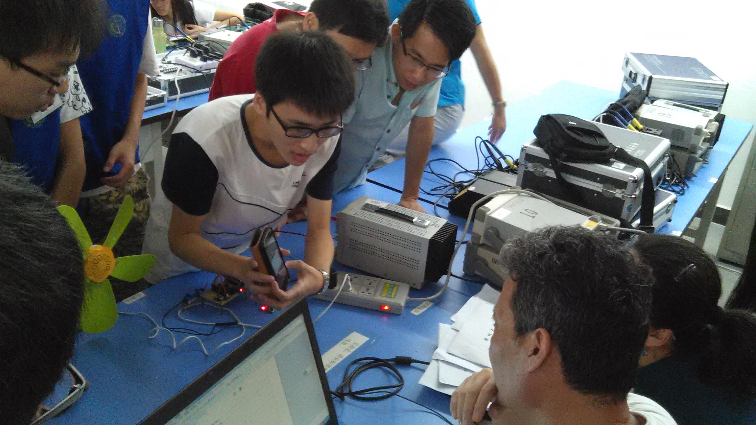 5月23日是比赛日,比赛现场设在科技楼负一楼实验室B105和B115。比赛分为低年级组和高年级组,其中低年级组的比赛题目包括“差动放大器”和“简易会议发言计时器”;高年级组比赛题目包括“光环境测量调节系统”、“手机‘WIFI’无线通讯记录系统”和“智能城市--开放式命题”。虽说参赛的高年级学生只能选高年级组题目,低年级学生原则上只能选择低年级组题目,但低年级学生也可以选择高年级组题目。因此在高年级组的比赛现场除了有低年级学生观赛学习,也有不少低年级学生在参赛。比赛现场气氛很热烈,评委老师对于参赛作品认真地进行审核,观赛的学生对选手们的作品充满好奇。