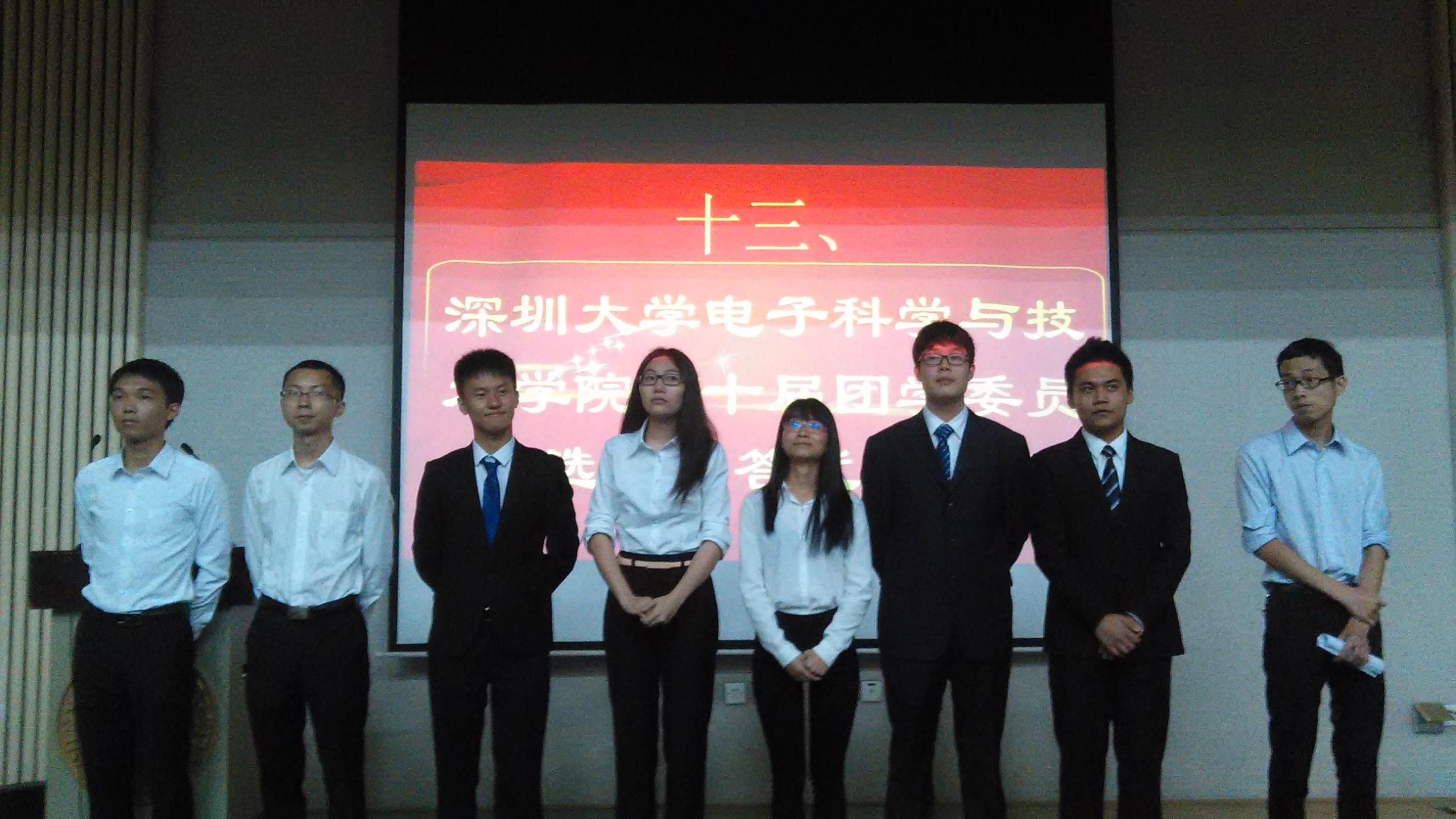 2015年5月29日,电子科学与技术学院(以下简称电子学院)第十届学生代表暨团委学生会换届选举大会在科技楼3号报告厅举行。电子学院党委副书记林济霖老师、团委书记张喆、电子学院第九届学生主席团和学生会成员、兄弟学院信工学院等学院的有关领导出席了会议。电子学院学生积极参加,座无虚席。本次大会的主要内容是电子学院団委、学生会、义工分会、学代会(学生代表委员会的简称)、创新协会的干部换届。