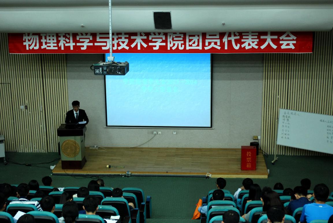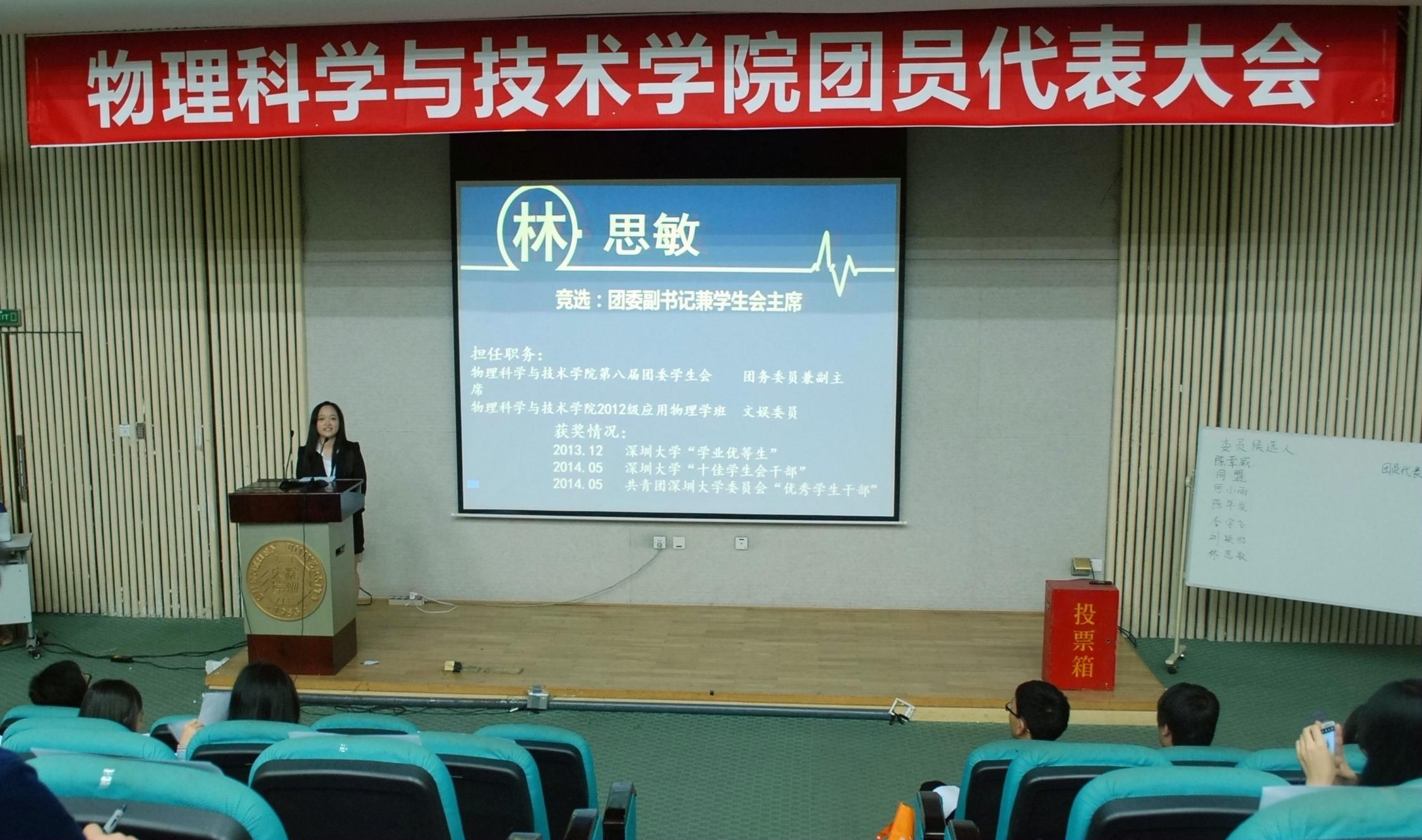 10月24日,物理科学与技术学院团委学生会第九次代表大会在科技楼3号报告厅召开,并顺利举行换届选举。参加会议的有学院第八届团委、学生会委员和各班级团的代表和学生代表。学院党委书记兼副院长林晓东教授和思想政治辅导员张兆荣老师作为领导和嘉宾出席了会议。大会开始,林晓东教授给我们作了重要讲话。紧接着,学院第八届团委副书记兼学生会主席陈嘉豪代表作上工作总结。其后,各竞选人上台演讲,竞选学院第九届团委委员及学生会各部门部长,最终由学生团员代表投票选举产生。其中林思敏当选第九届团委副书记兼学生会主席,刘颖怡当选团务委员兼学生会副主席,陈幸威当选文娱委员兼文娱部部长,陈华发当选宣传委员兼宣传部部长,同盟当选社工委员兼外联部部长,李宇飞当选体育委员兼体育部部长,何小雨当选学习委员兼学术部部长。