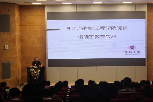 学院院长伍晓宇教授首先代表学院致辞。伍院长表达了对新生的热烈欢迎,介绍了学院的历史、现实情况以及未来发展方向,指出学院拥有优越的硬件设施以及强大的师资队伍,并对新生以及家长报考深圳大学机电学院的选择表示祝贺与赞赏。伍院长还结合中美贸易战等热点问题,勉励新生们践行“自立、自律、自强”的校训精神和“工以新、匠以精、学以勤、知以行”的院训精神,希望大家能够志存高远、树立目标、努力奋斗,成为对国家有用的人才。学院党委书记邓元龙教授也表达了对新生的期许和祝福。他希望同学们能够珍惜大学时光,在深大学有所成。