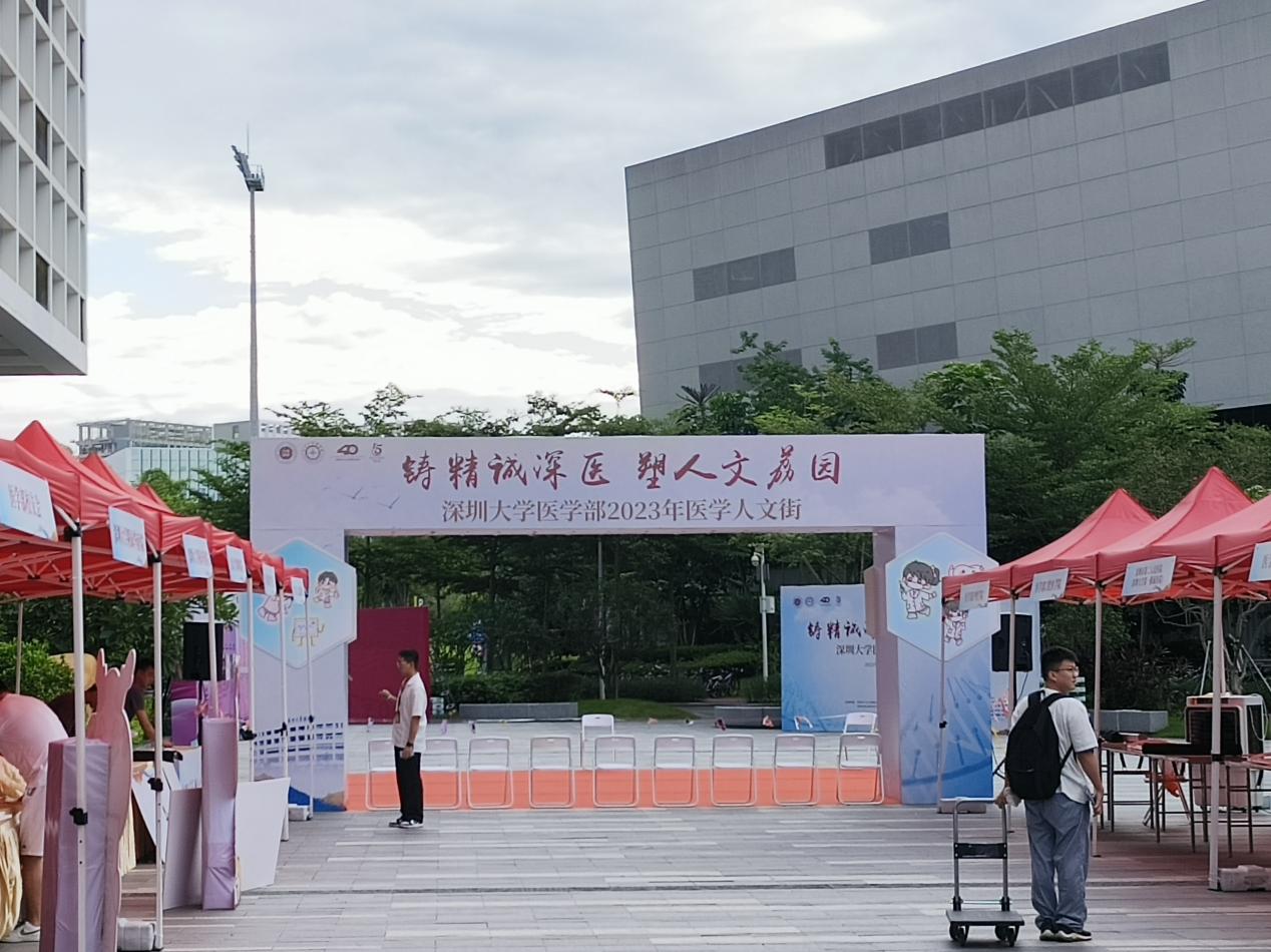 9月11日8:40-18:00,深圳大学医学部2023年医学人文周系列活动之“医学人文街”在丽湖校区一期宿舍楼下正义广场举行。活动以“铸精诚深医·塑人文荔园”为主题,由23个不同单位共同参与,包括深圳大学第一附属医院、深圳大学总医院、深圳大学附属华南医院、深圳市罗湖区人民医院、北京大学深圳医院、深圳市妇幼保健院等6家临床教学基地,医学部各学院,医学部校友会,及医学部各学生组织和社团。各单位以“摊位”形式,结合自身特色,开展不同主题的医学人文活动。