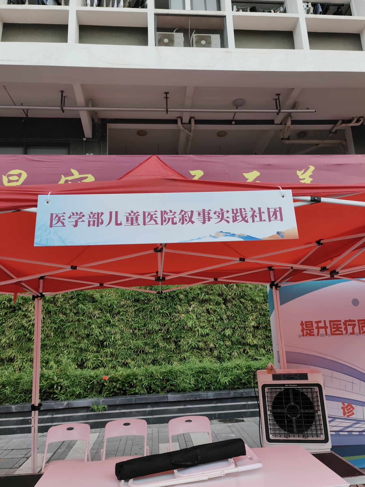 各个摊位百花齐放,让人印象深刻的是儿童医院的叙事实践社团。深圳市儿童医院创建于1997年,位于深圳市中心区,是一家集医疗、保健、科研、教学、康复为一体的综合性儿童医院,也是广东省唯一一家三级甲等儿童专科医院。风起云涌观后海,仁术仁心致精诚。创院廿载,护佑健康,托起希望,初心不改,深圳市儿童医院将持续以学科建设为核心,医教研全面协调发展,打造粤港澳大湾区儿科医疗高地,建设一家有温度的现代化国际化高水平儿童医院。在发展叙事医学的道路上,深圳市儿童医院更是砥砺前行,硕果累累。建院至今,深儿医坚持着撰写平行病历的叙事传统,开创“患者能量包 ”、“患者叙事 ”等医学人文活动,2021年6月7日,深圳市儿童医院在重症医学科(PICU)设立的儿童安宁疗护病房揭牌启用,该安宁病房是由中集集团出资捐赠建设,也是华南地区首个在儿童医院内设立的专为儿童提供安宁疗护服务的病房,同时,该院的安宁疗护多学科协作组也正式成立。叙事实践社团于2020年3月3日成立,由深圳大学2020级医学部师生协同深圳市儿童医院共同创办,目前有20级及21级社团成员共计50人。社团活动开展基于课程——《温暖的医学》,致力于领悟叙事医学“吸收、解释、回应患者故事与困境”的核心思想,培养叙事医学“观察、倾听、诉说、记录疾病”的能力。社团专注于观察和倾听儿童医院的小患者们的故事,并把这些故事以医学生的视角记录并诉说,帮助大家听到他们的声音,体验他们的感受,回应他们的期待。此次“人文一条街”活动中,该社团设置了3项既有趣又含有医学人文色彩的活动,包括记忆棋盘游戏、医学知识竞答和V-care加油站。“V-care加油站”项目灵感来源于设立深圳市儿童医院供小患者娱乐放松的“V-care关爱空间”, 大家可以在此摊位捐赠自己手中的实用小物件、玩具和书籍等,希望能汇聚四面八方的点滴奉献,共促儿童医学人文的发展。