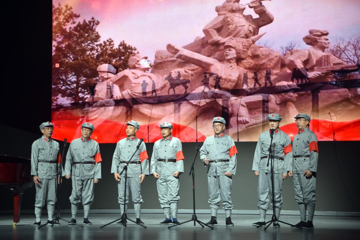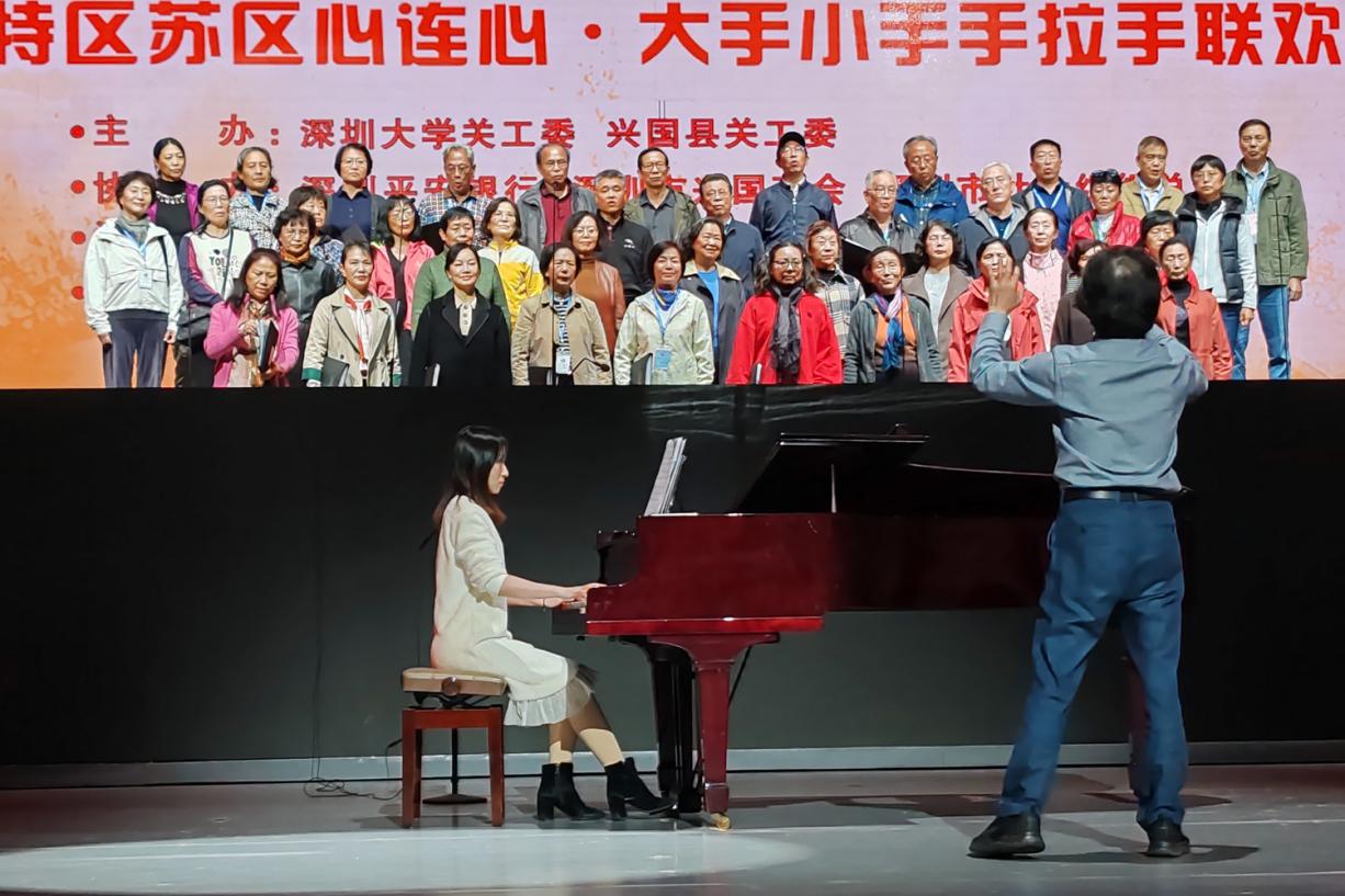 5日下午4点,“秋韵舞潋水,晨光耀中华——特区苏区心连心,大手小手手拉手联欢会”在兴国长征组歌大剧院拉开帷幕。深圳大学秋韵艺术团与兴国老年大学、官田小学“军爱童声”合唱团表演了精彩节目。秋韵艺术团的合唱《苏区干部好作风》和《不忘初心》是开场曲,合唱《深大人之歌》《我是兴国好儿郎》《春风十万里》的压轴。我们带来的节目还有女声小组唱《山楂树》《灯碗碗开花在窗台》,男声五重唱《游击队歌》,女声三重唱《回娘家》,钢琴独奏《呼唤》,男女声四重唱《祖国不会忘记》,钢琴四手联弹《让世界充满爱》《康康舞曲》。这些节目与兴国官田小学童声合唱团的《我们是共产主义接班人》,兴国老年大学的舞蹈《黄河水从我门前过》《寻遍千山只为你》、男女声对唱《四星望月味道长》、原创情景剧《红色讨米人》等节目穿插进行。讲述战斗受伤,“腰缠万贯”宁愿乞讨,女儿重病也不动党的经费一分一毫的苏区干部刘启耀事迹的《红色讨米人》,深深感动关工委和艺术团的老师们。