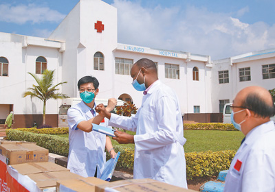 中国第二十二批援卢旺达医疗队不久前向卢旺达东方省的基本戈医院捐赠了一批医疗和抗疫物资,包括医用防护服、一次性无菌手术衣、医用外科口罩等。图为中国医疗队队长彭际奎(左)向该院院长加希马·约翰交接捐赠物资。