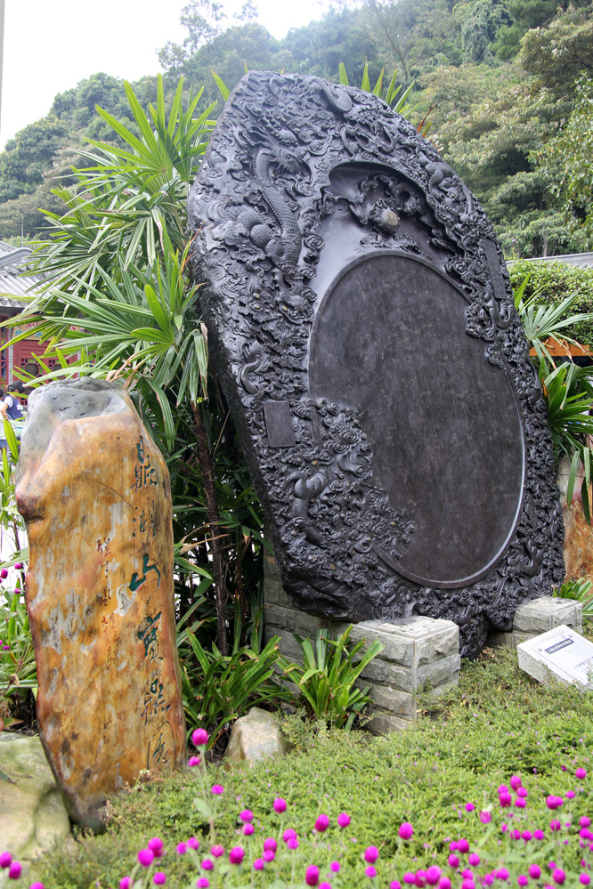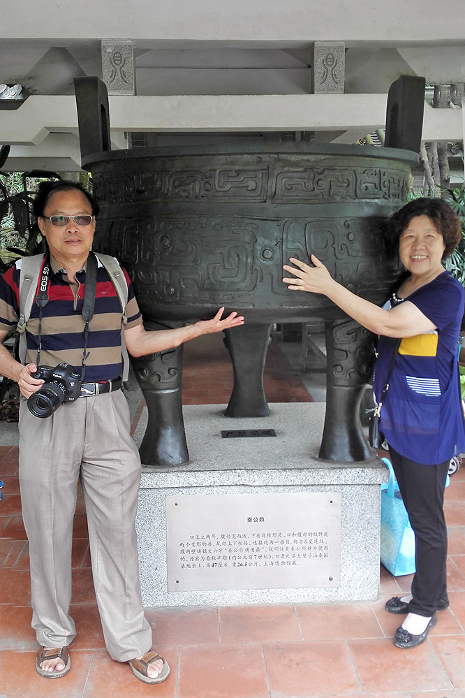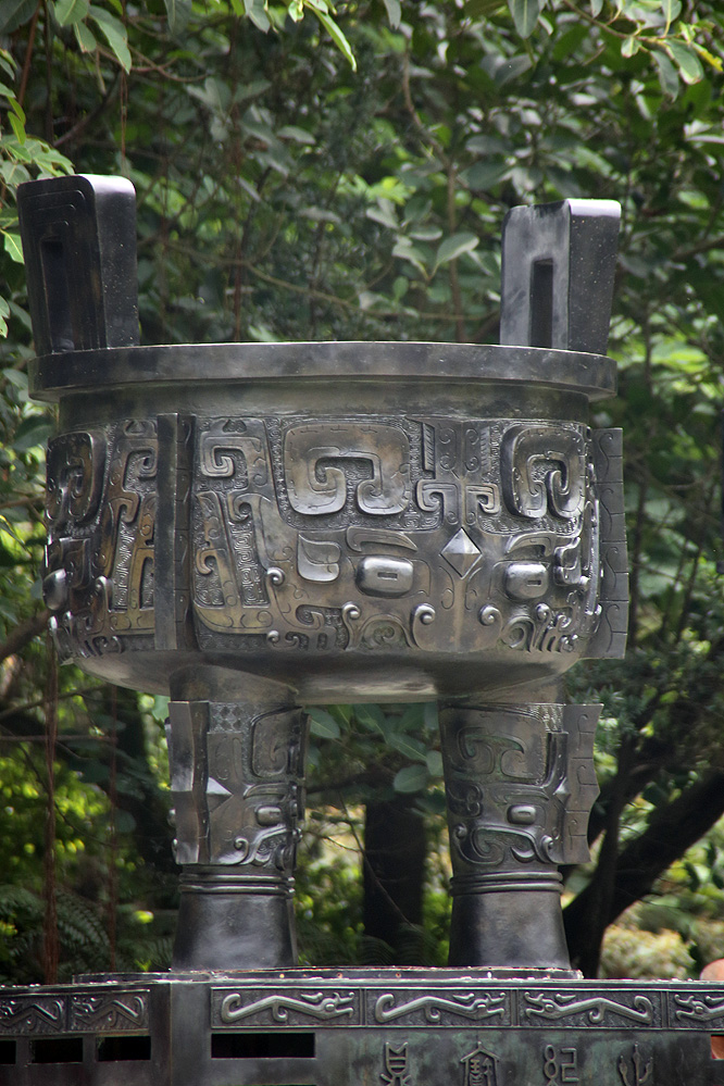 目前鼎湖山分天溪、云溪和天湖三大景区。旅游车把我们送到宝鼎园。宝鼎园近年开发的一个新景点,位于天湖景区,占地约1.3万平方米,园内青山环抱,风景优美。宝鼎园的入门处,有一个巨大的端砚,重达2吨,据说已入选吉尼斯记录。端砚是肇庆出产的砚台,位居四大名砚之首,早在唐代著名诗人李贺就有“端州石工巧如神,踏天磨刀割紫云”的诗句称颂端砚。因此端砚是肇庆的一块亮丽名片。宝鼎园中有一条古鼎长廊,宣传中国的鼎文化,还有时任国家主席江泽民赠送联合国的“世纪宝鼎”复制品。而居于园中间的是由著名青铜器专家、国家文物鉴定委员会委员马承源教授设计创作、巨大无朋的九龙宝鼎。该鼎高6.68米,口径5.58米,重16吨,为世界之最。九龙宝鼎具有宽大的双耳,外侧各饰10条蟠龙,二十寓意置立此鼎喜迎新千年的时代。口沿下有三组对称龙纹,为六龙,加上三足顶端有三个大龙头,共有九龙。九是最大数,龙是中华民族象征,九龙寓意深刻。腹部是波曲纹,环回旋曲,似众多重叠山岭,寓意祖国大地山川充满生机和稳定。