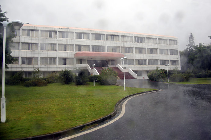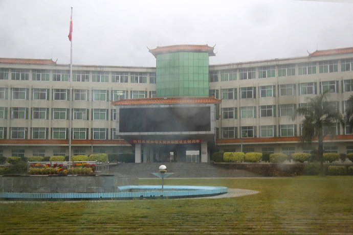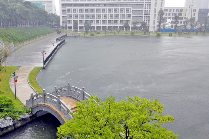 在肇庆大道与肇庆学院的交汇处,有一个肇庆学院的牌坊,上面是著名书法家启功先生书写的“肇庆学院”4个字。经过牌坊再经过一个铁路口,就到了学院大门。我把车缓缓开进去,沿着校园边缘逆时针转了一圈,经过当年当学生时的宿舍、当教师时的住房、新建的体育馆、文笔峰、翰墨湖、砚湖,回到行政楼前面。因为风大雨大,没有多作停留,也没有通知任何老师同学校友,就匆匆离开了。