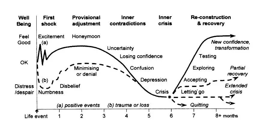 这是指人经历变故(如悲伤事件)或新奇事件(如学新东西)时的心理变化周期过程。